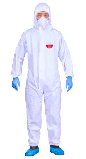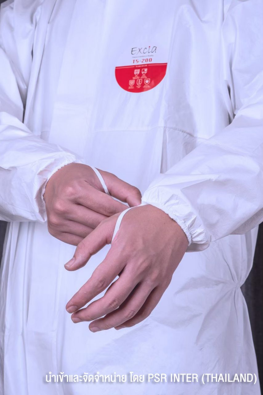 ชุดCoverall ยี่ห้อ Excia แบบใช้แล้วทิ้ง รุ่นพิเศษ มีสายคล้องหัวแม่มือ ป้องกันการร่นของแขนเสื้อ ใช้สวมใส่คลุมทั้งร่างกายตั้งแต่ศีรษะจรดเท้า เพื่อปกป้องร่างกายจากฝุ่นละออง สารเคมีที่เป็นอันตรายจากการกระเซ็น และละอองของเหลวสิ่งปนเปื้อน มาตรฐาน EN Standard